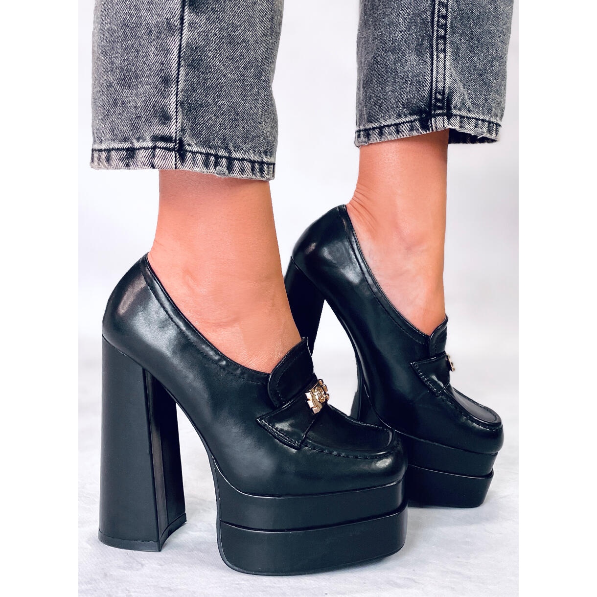 Tacchi neri di Ambra - nero, elegante e coraggioso. I mocassini da donna a ruote alte (14,5 cm) con una piattaforma da 5 cm è una proposta per le donne che vogliono aggiungere altezza e carattere, non rinunciare al comfort. Il modello in nero universale con naso quadrato e zirconi decorativi sarà ottimo per occasioni speciali e nelle stilizzazioni urbane.
