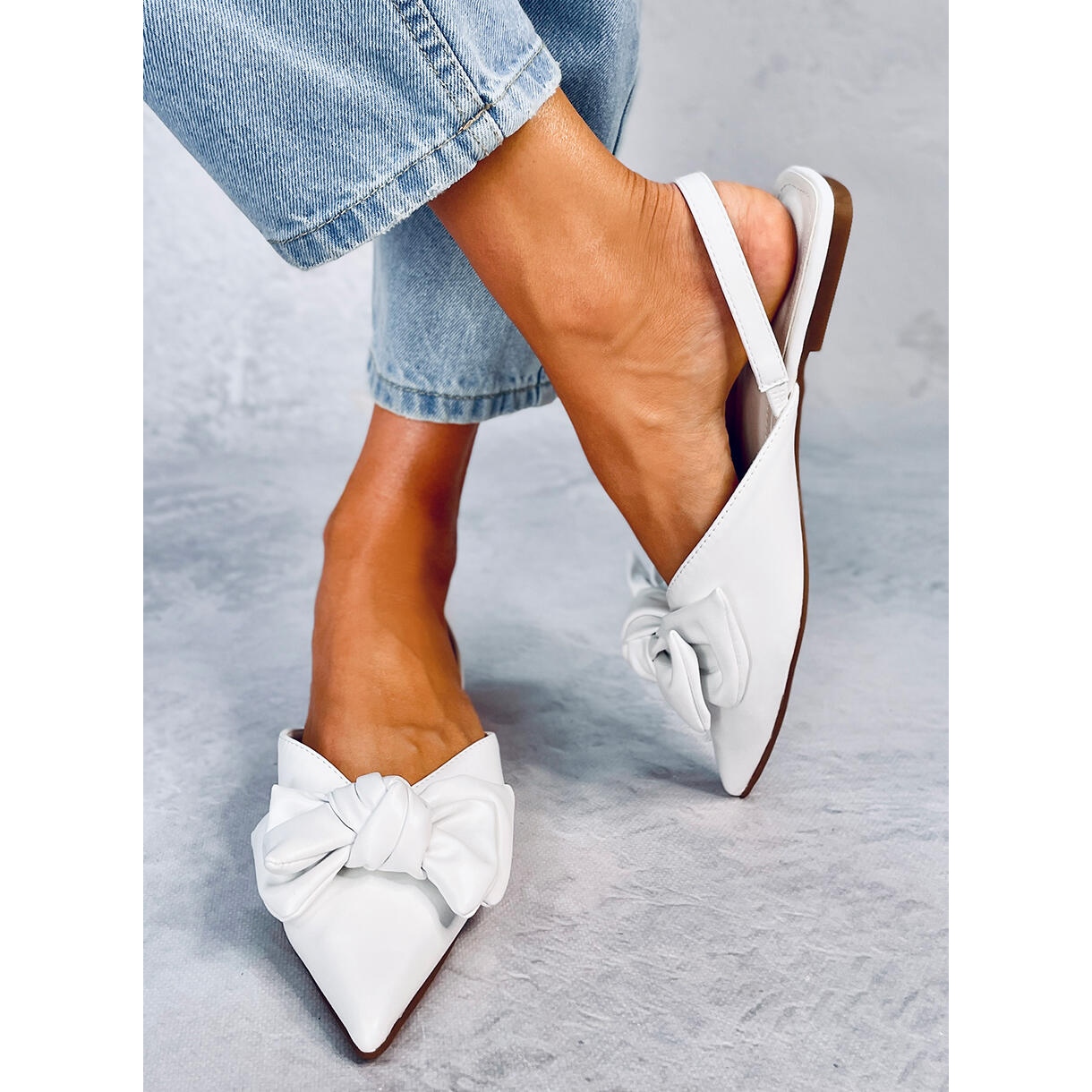 Il taglio pulito con punte leggermente appuntite conferisce loro un carattere raffinato, e l'attenzione è attirata principalmente dall'incantevole fiocco che aggiunge una grazia discreta alle scarpe. Questo è un dettaglio che rende le ballerine sorprendenti per la loro originalità, pur rimanendo nel classico bianco, facile da abbinare a svariati outfit.