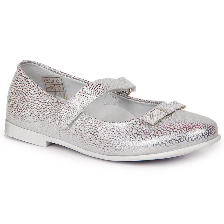 Scopri le ballerine da comunione da bambina alla moda con chiusura strappo, la scelta perfetta per le occasioni speciali. Il modello Kornecki 6493 nell'elegante colore argento unisce stile e comodità, creando un complemento perfetto per lo styling di ogni ragazza. Realizzate in pelle ecologica di alta qualità, queste ballerine colpiscono per la loro resistenza ed estetica.