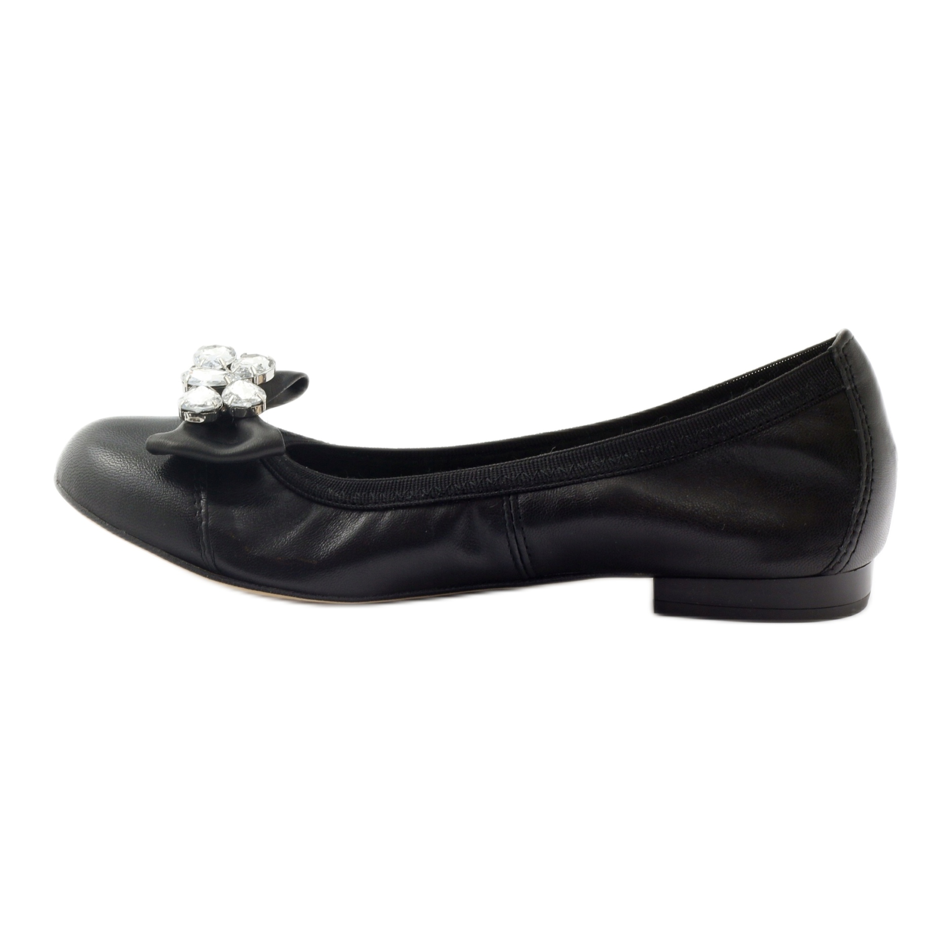 Eleganti ballerine da donna modello Gamis. 1402 - classico con una lucentezza discreta. Realizzato in pelle naturale di alta qualità in un colore nero universale, con un fiocco decorativo tempestato di cristalli che aggiungono stile pur mantenendo un'eleganza discreta. Il modello con tacco delicato (1,5 cm circa) è perfetto sia per l'uso quotidiano che per le occasioni più formali. L'orlo si adatta perfettamente al piede e il sottopiede in pelle rivestito in morbida spugna garantisce comfort per tutto il giorno. Ballerine slip-on con punta tonda: uno stile senza tempo dell'ultima collezione primavera-estate.