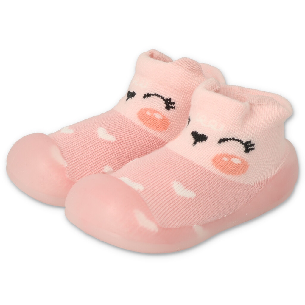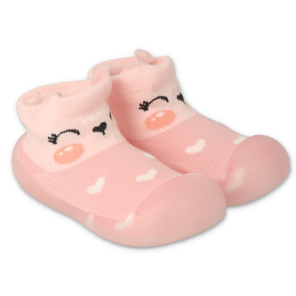 Queste scarpe da passeggio sono costituite da una calza elastica che copre perfettamente il piede e da una suola antiscivolo che garantisce stabilità e sicurezza. Grazie al loro design ben studiato, non gravano sul piede del bambino né esercitano pressione su di esso, il che è estremamente importante in una fase così precoce dello sviluppo. La forma della scarpa assicura che non scivolino quando il bambino si muove, garantendo comfort durante l'uso.