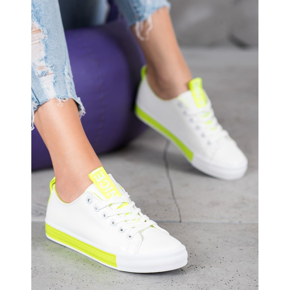Presentiamo l'ultimo modello di scarpe da ginnastica sportive Nice del marchio Bestelle, che deliziano con il loro design originale e il comfort di indossamento. Queste sneakers bianche con caratteristici inserti gialli sono la scelta perfetta per ogni donna che vuole distinguersi dalla massa.