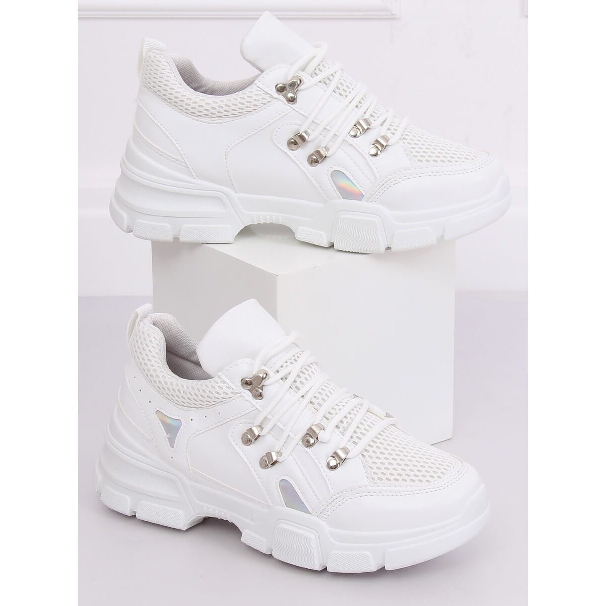 Scopri stile e comfort unici nelle scarpe sportive bianche CB19080 bianche! Queste sneakers da donna sono una combinazione di classico e moderno che attireranno sicuramente l'attenzione. Il loro design originale decorato con mesh e inserti olografici li rende perfetti per le tendenze moda attuali.