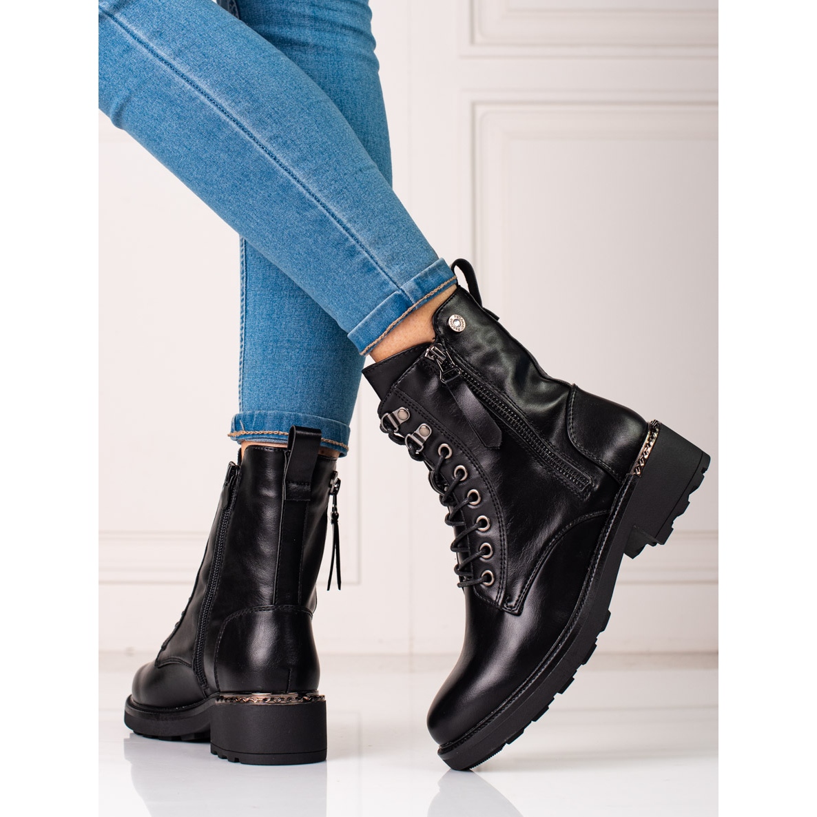 Scopri l'ultima tendenza in fatto di calzature per la stagione autunno/inverno con gli stivali stringati da donna Shelovet nel classico colore nero. Questi eleganti stivaletti sono realizzati in pelle ecologica di alta qualità, che li rende non solo un accento alla moda, ma anche una scelta rispettosa dell'ambiente. Grazie al tallone irrigidito integrato, i tuoi piedi si sentiranno comodi e stabili.