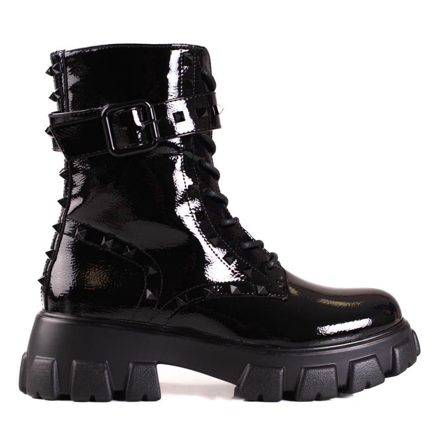 Realizzati in pelle ecologica verniciata, gli operai si distinguono per il loro aspetto elegante, e l'uso delle borchie conferisce loro un accento distinto e audace. Il contrafforte integrato e irrigidito del tallone e l'isolamento interno sotto forma di pelliccia garantiscono comfort di utilizzo e protezione dal freddo.