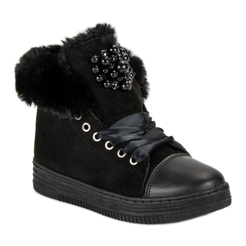 Il colore nero li rende estremamente universali e facili da abbinare a vari stili, sia quotidiani che più eleganti. Lo spesso isolamento e l'inserto in pelliccia garantiscono calore nelle giornate fredde, mentre la punta completamente rotonda aggiunge leggerezza ed eleganza. Un ulteriore vantaggio sono i lacci allacciati alla moda, che rendono le scarpe comode e si adattano al piede.