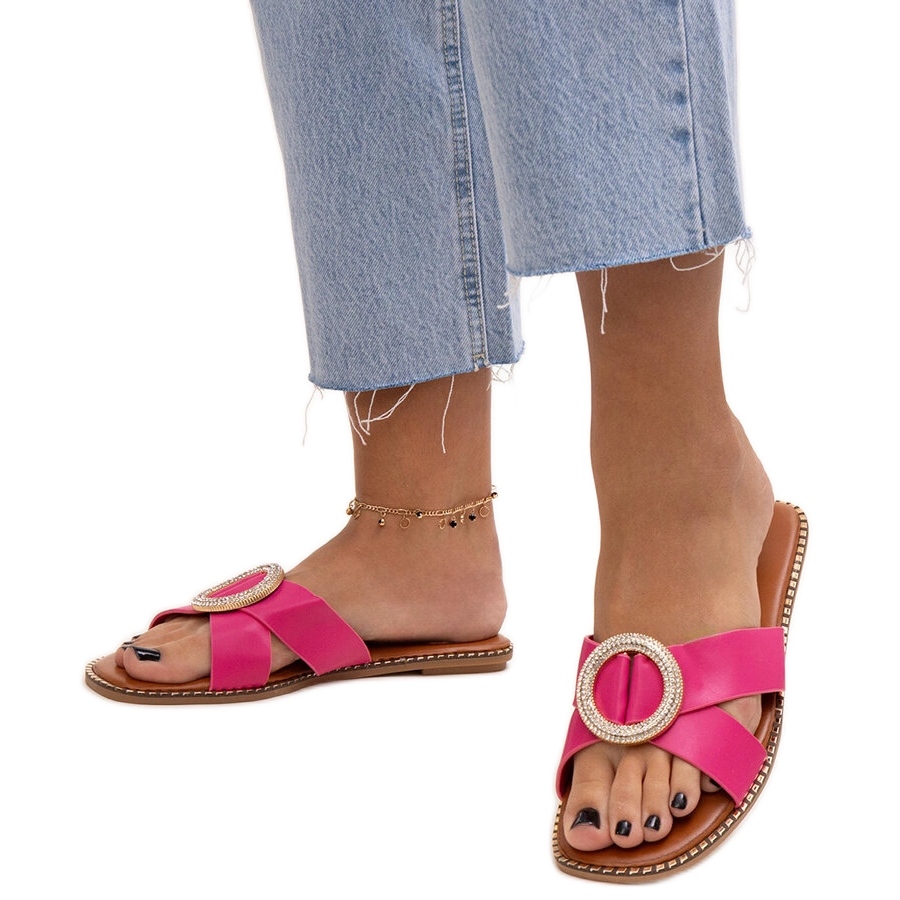 Queste eleganti infradito sono decorate con zirconi luccicanti subthesivamente, che danno loro lucentezza e stile, perfettamente adattarsi alle tendenze estive. Realizzati in pelle ecologica di alta qualità e gomma, sono sia durevoli che pratici, ideali per le stilizzazioni quotidiane. La suola beige offre comfort durante la camminata e il colore rosa integrato con accenti dorati è un'ottima combinazione, che puoi facilmente adattarti a diversi abiti.