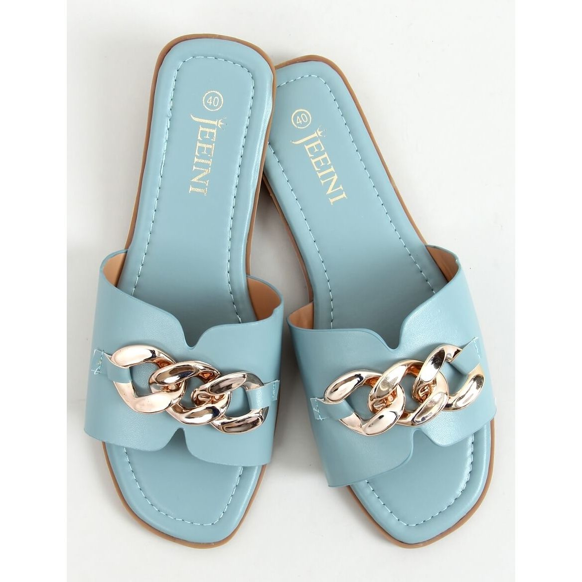 Realizzate in pelle ecologica di alta qualità, queste infradito uniscono comodità ed eleganza. I colori nei toni del blu con accenti di catena dorata li fanno abbinare perfettamente con abiti estivi e stili casual. La suola beige aggiunge sottigliezza e il tacco piatto la rende comoda da indossare tutto il giorno.