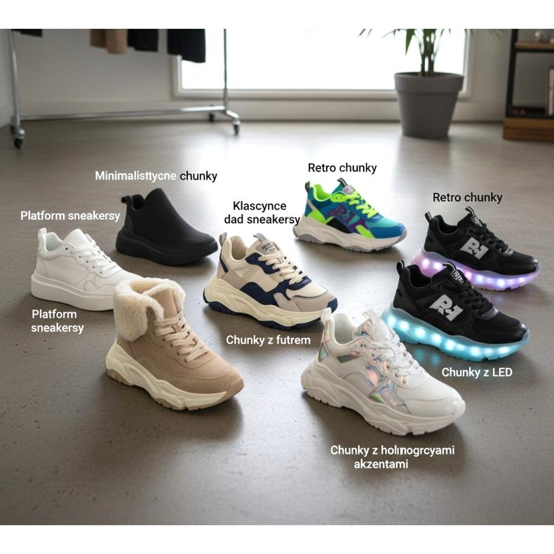 Sul mercato sono disponibili diverse varianti di sneakers Chunky, che differiscono per il grado di "massiccità", materiali e stile.