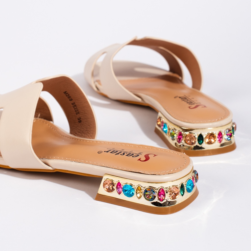 Questo modello è caratterizzato da un dispositivo di fissaggio scorrevole e da un tacco aperto, il che rende messo e togliendoli velocemente e semplice. Una suola liscia in plastica durevole garantisce stabilità e comfort durante la camminata. Inoltre, gli strass sottili danno ai Flaps un accento elegante, rendendoli perfettamente fondersi con le stilizzazioni quotidiane e gli abiti più eleganti.