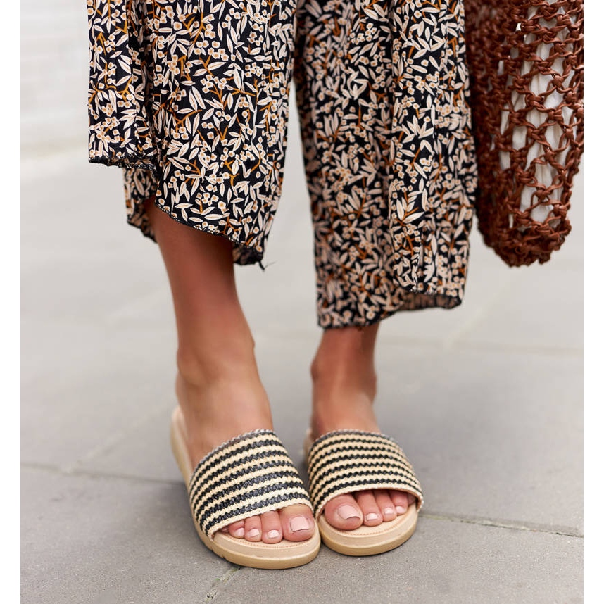 Il modello è caratterizzato da un tacco piatto alto 3 cm, che li rende non solo stilosi, ma anche molto comodi da indossare tutto il giorno. Grazie alla numerazione standard, puoi facilmente adattarli alla tua taglia. Il loro esclusivo motivo a strisce aggiunge carattere e la mancanza di punta offre libertà e ventilazione, il che è particolarmente utile nelle giornate più calde.