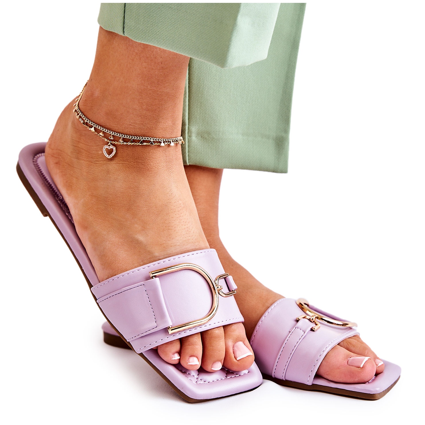 Le infradito da donne classiche ed eleganti in un colore viola alla moda, realizzate in pelle ecologica di alta qualità. La cinghia anteriore adorna una catena efficace e l'inserto eco-inolide morbido e trapuntato offre comfort durante il giorno. Il modello è incorporato su un tallone piatto (1,5 cm) e una suola non slittata, beige - perfetta per i giorni caldi.