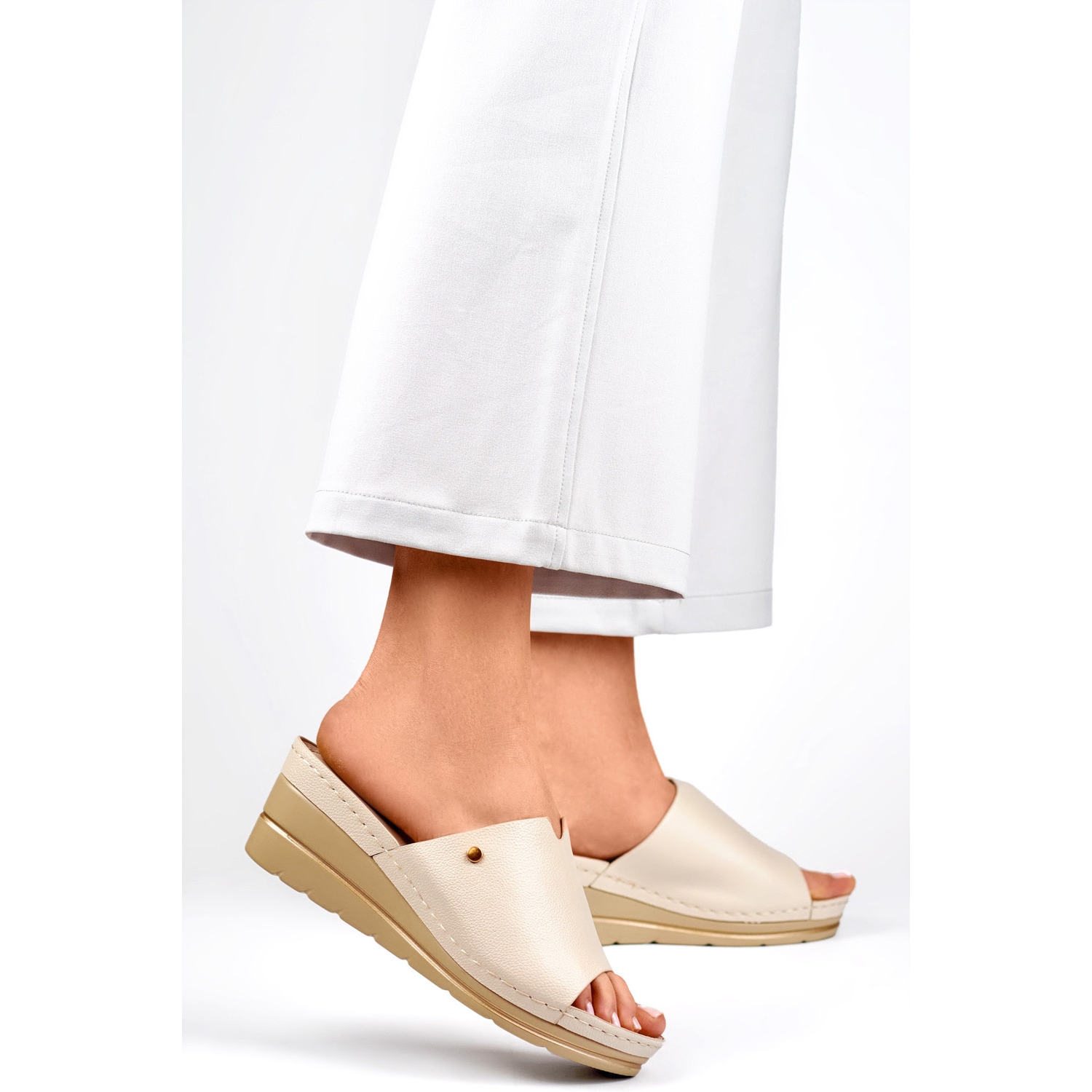L'interno dei lembi è rivestito con pelle naturale, che garantisce un'eccellente ventilazione e un efficace assorbimento di umidità. Grazie a questo, anche durante le lunghe ore, i piedi rimangono freschi e asciutti. Il tallone sotto forma di un cuneo alto 5 cm dà loro un aspetto elegante, garantendo stabilità e comfort ad ogni passo.