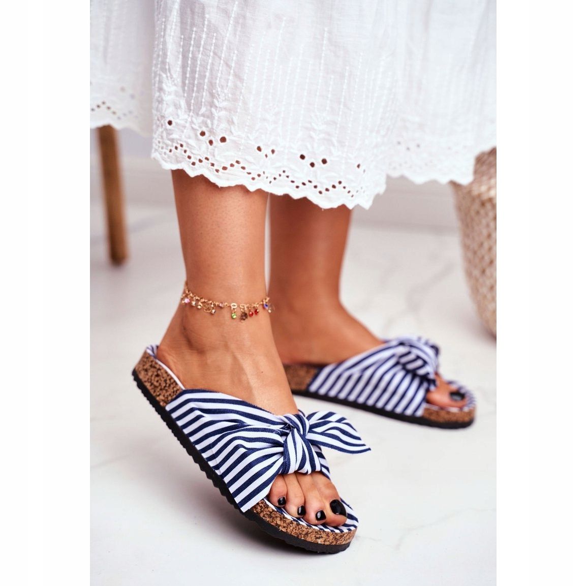 Un elegante fiocco aggiunge un fascino unico all'intero capo, attirando l'attenzione e sottolineando la femminilità. Le strisce blu navy e bianche con cui sono arricchite le infradito trasudano stile e freschezza, che le rendono un'ottima aggiunta agli stili estivi, sia per la spiaggia che per la città.
