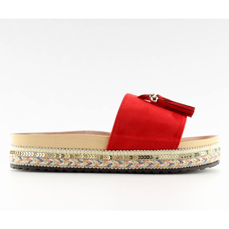 Preparati per l'estate con le infradito rosse LS-93 da donna! Queste infradito alla moda sono caratterizzate da una suola alta e profilata, che non solo aggiunge stile, ma garantisce anche comfort quando indossate. Basta uno sguardo per innamorarsi del loro fascino: originali decorazioni sulla suola e graziose nappine attirano l'attenzione e conferiscono alle scarpe un carattere unico.