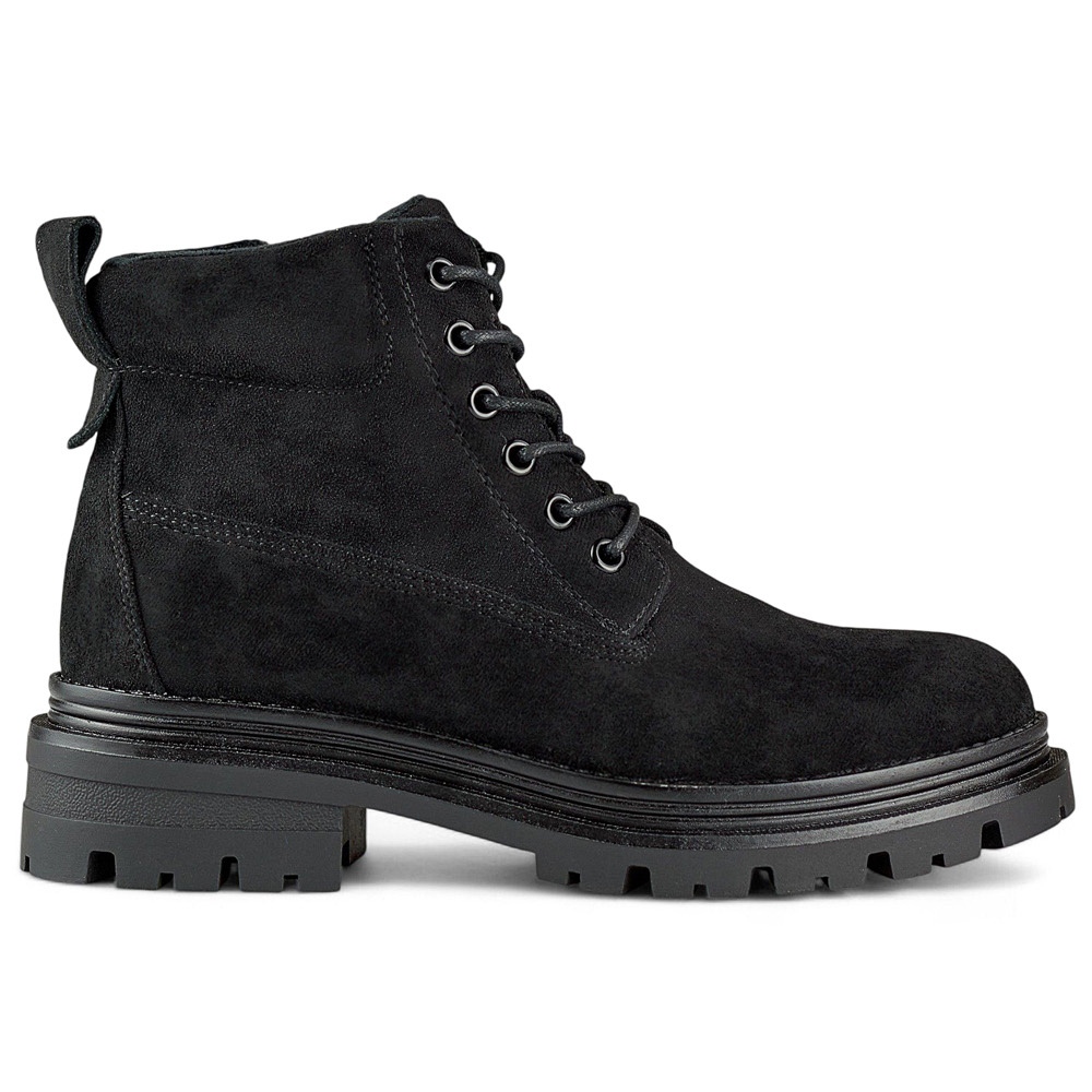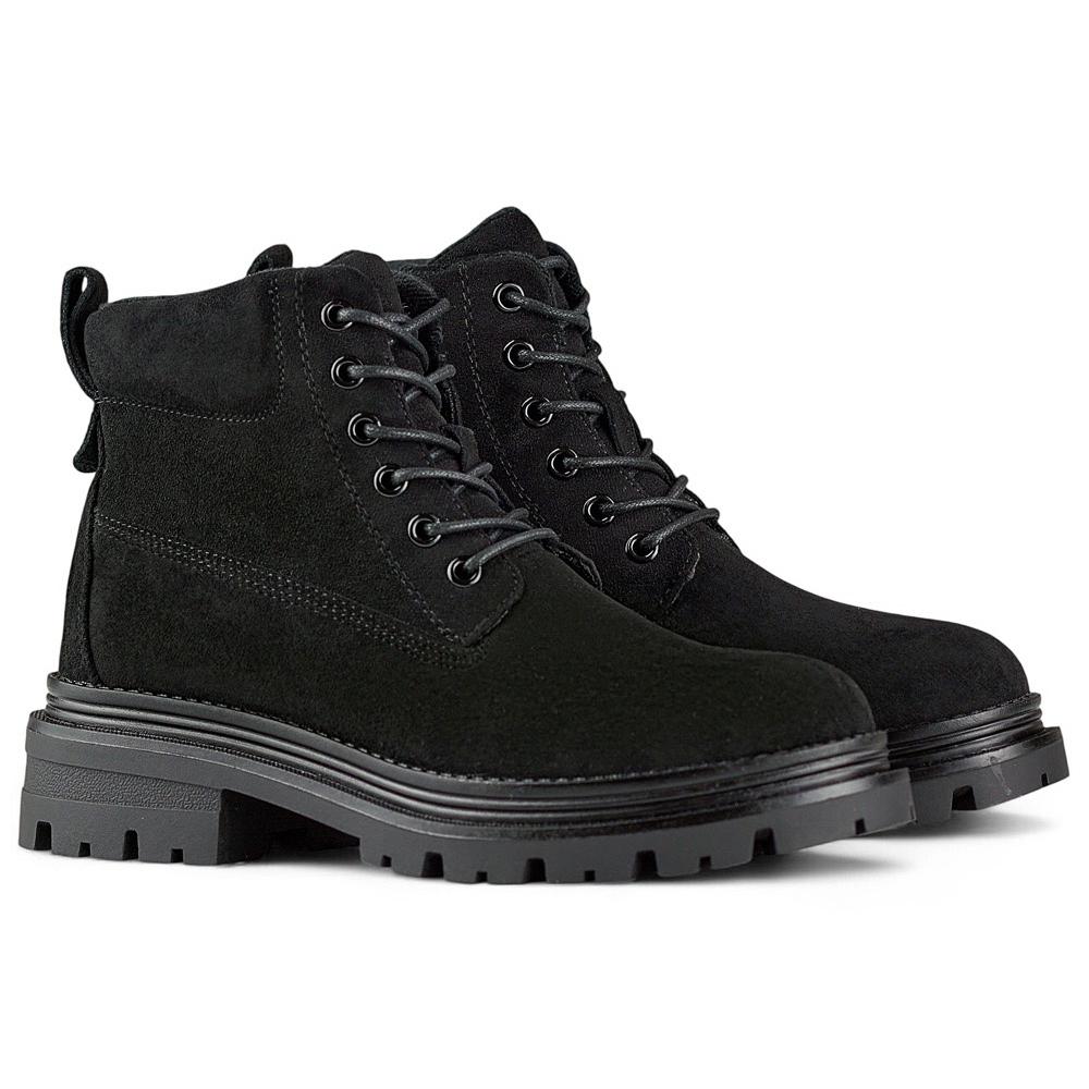Realizzati in pelle scamosciata ecologica, i trapper si divertono con i loro tagli snelli e un colore nero universale, che si adatta perfettamente a diversi stili. La tomaia alta 12 cm si estende sulla caviglia, fornendo ulteriore supporto e protezione nei giorni più freddi, mentre l'isolamento della pelliccia di ecota fa rimanere caldi e comodi durante il giorno.