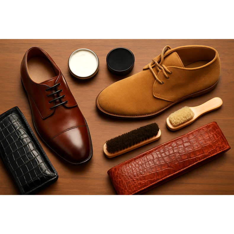 Skin liscia (grana): la cura standard di creme e paste, può essere lucidata per la lucentezza. Suede e nubuk: solo pennelli e preparati speciali, non usano mai le creme standard, spazzola regolarmente "sotto i capelli". Pelle dipinta: tagli delicati leggermente inumiditi, preparati speciali, evita creme di cera. Pelle pressata (bastardo): attenzione speciale durante la pulizia, attaccare delicatamente la crema, non premere saldamente sul motivo. Pelle esotica (serpente, coccodrillo): preparazioni specializzate, creazione più rara, cautela con acqua. Skin olio (pull-up): cure minime, "tratta" mentre si indossa.