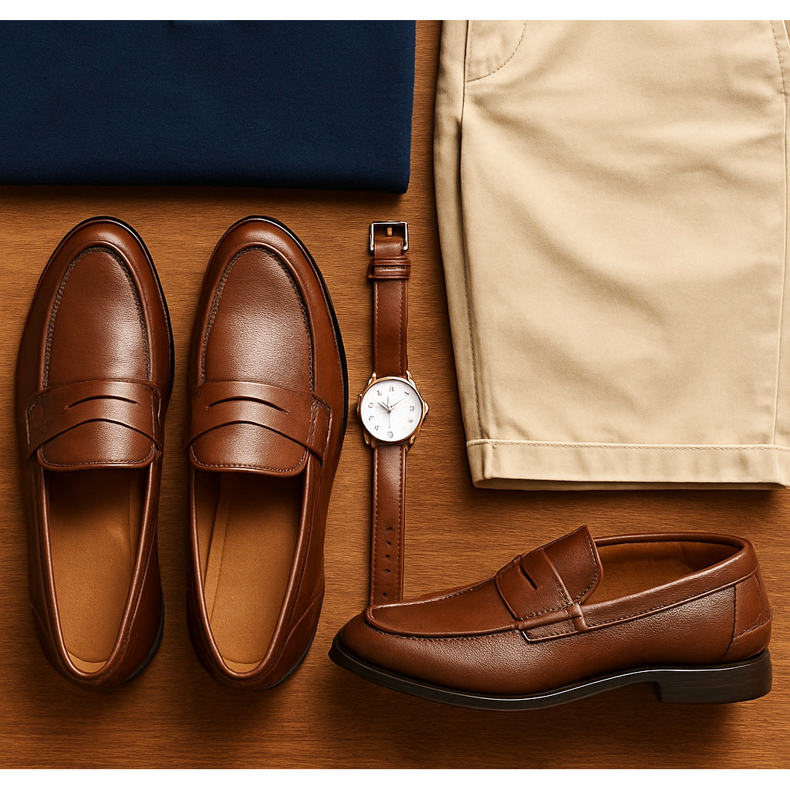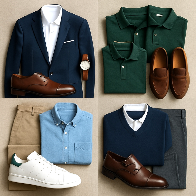 Jeans scuri + polo/maglione + mocassini marroni o stivaletti Chelsea.