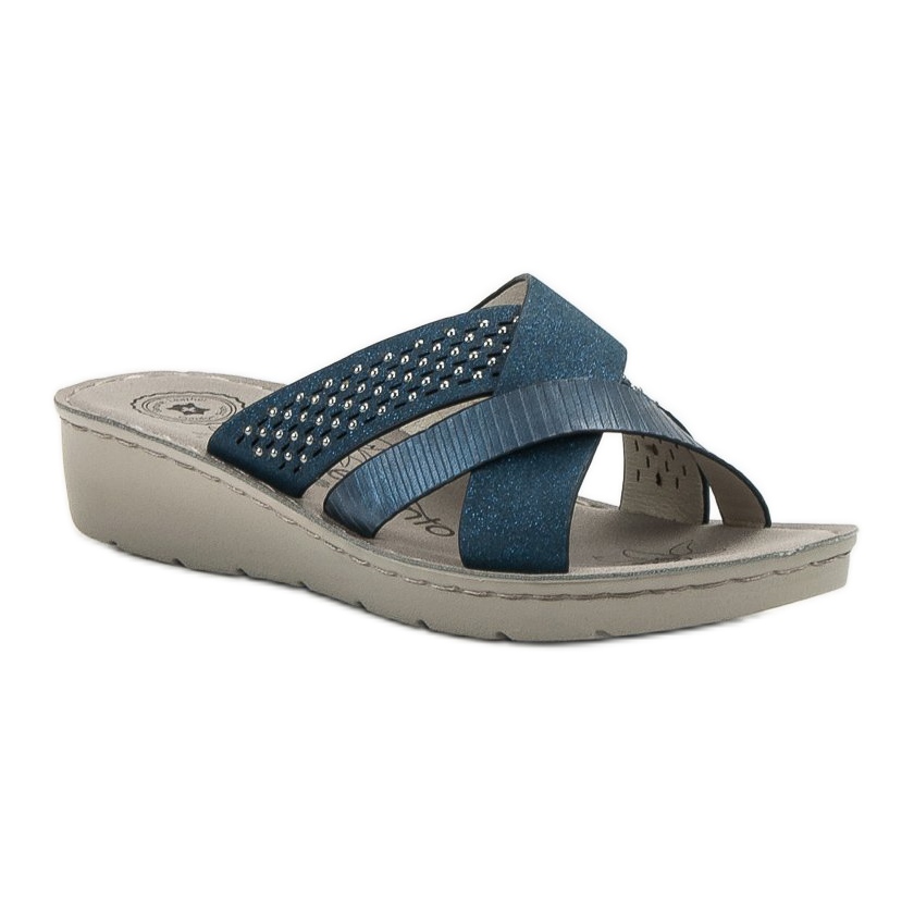 Questo modello si distingue per la zeppa di 4 centimetri, che aggiunge una silhouette più snella e allo stesso tempo fornisce un sostegno adeguato durante la camminata. Il tallone aperto e il design slip-on rendono la calzata veloce e comoda. Inoltre, il colore blu con sottili strass conferisce loro un carattere alla moda, che li rende una scelta perfetta per pantaloni, vestiti e pantaloncini.
