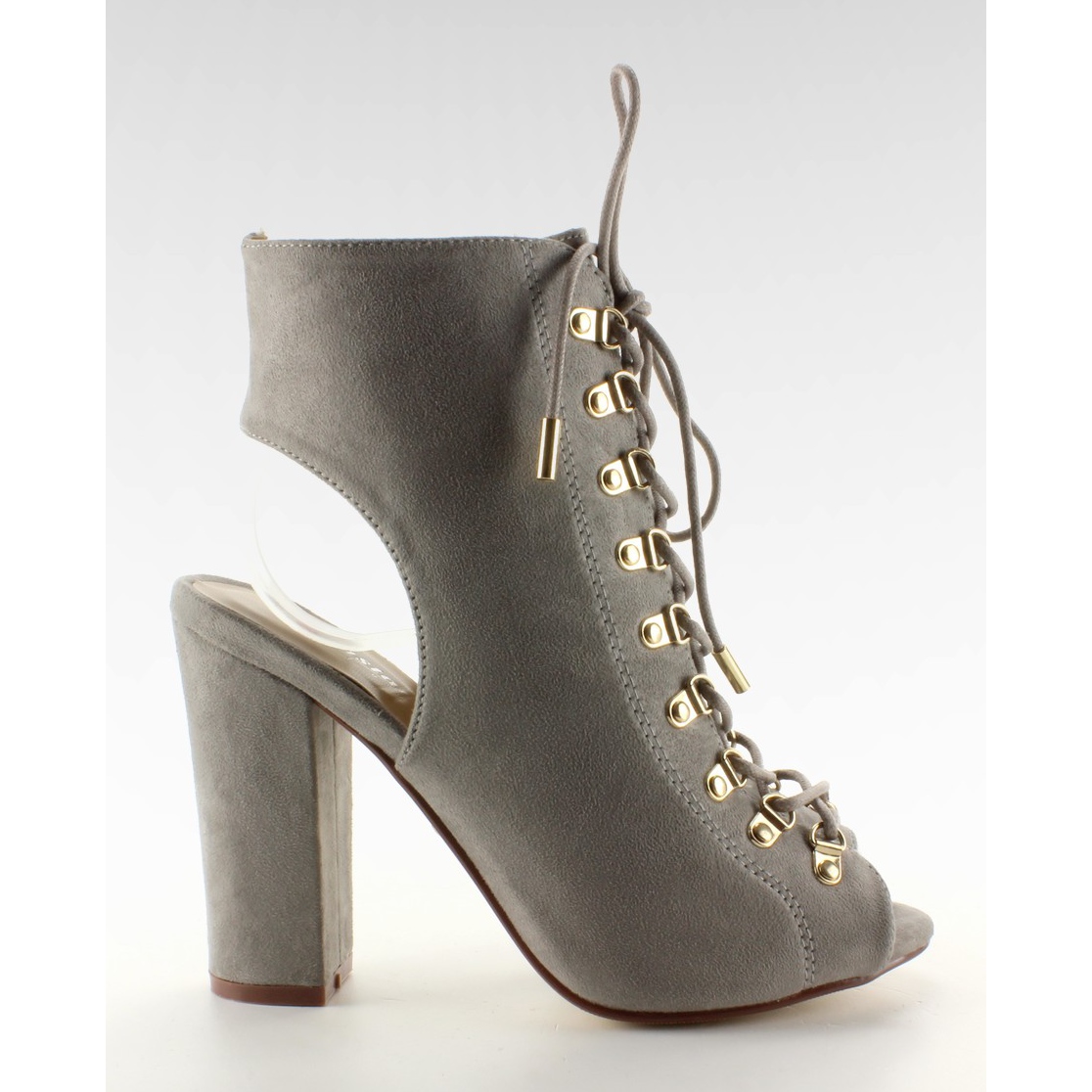 Eleganti e audaci décolleté da donna JZ-11P in una tonalità grigia alla moda. Realizzati in carnosa pelle ecologica dalla texture scamosciata, uniscono stile e funzionalità. Il modello arriva sopra la caviglia, ha la punta scoperta (open toe) e una parte anteriore della tomaia fittamente allacciata con occhielli dorati decorativi. All'interno è presente una cerniera per indossarlo facilmente. Un palo ampio e stabile con un'altezza di 11 cm garantisce un aspetto attraente sulla gamba.