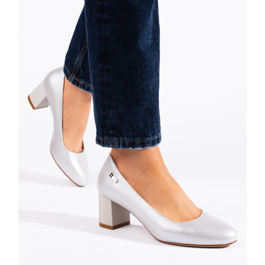 L'interno delle scarpe è stato rifinito con pelle naturale, il che garantisce una ventilazione e un comfort ottimali durante la camminata. Una suola di plastica liscia consente alcuni passaggi su varie superfici. Il complemento perfetto per gli abiti eleganti, queste pompe d'argento diventeranno sicuramente un elemento preferito della tua collezione di calzature.