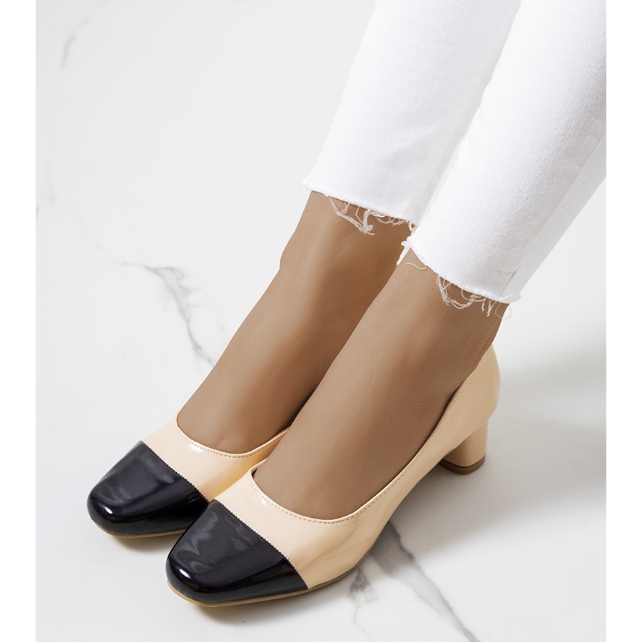 Il modello è dotato di un originale montante ovale con altezza di 4,5 cm, che garantisce stabilità e comodità per tutta la giornata. La punta quadrata conferisce loro un carattere moderno e la finitura laccata attira l'attenzione e si adatta perfettamente alle tendenze. Il colore beige con accenti neri si adatta a molti stili, sia casual che più eleganti.