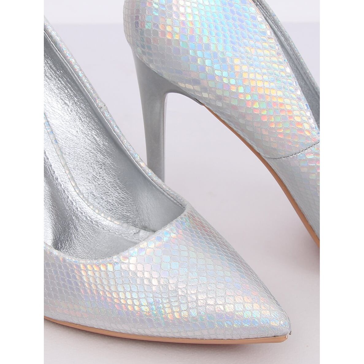 Le décolleté a spillo argento olografico NF-52 Silver sono la scelta perfetta per le donne che vogliono distinguersi tra la folla. Queste scarpe fenomenali deliziano non solo con la loro bella finitura olografica, che brilla di colori diversi a seconda della luce, ma anche con il loro design sottile con punte delicate e appuntite. Uno stiletto alto 10,5 cm aggiunge eleganza e slancia la figura, facendo sentire speciale ogni donna che li indossa.