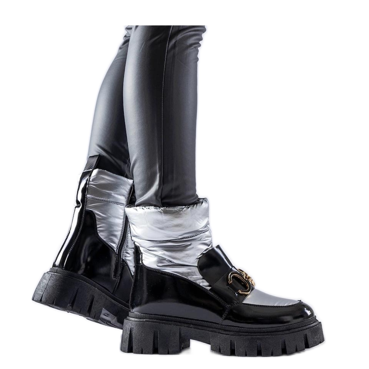 Gli stivali da neve verniciati in nero e argento sono la soluzione perfetta per ogni donna che vuole combinare lo stile con la funzionalità in condizioni invernali. Queste eleganti scarpe alla caviglia sono caratterizzate da un design unico, che combina un colore nero alla moda con sottili accenti d'argento.