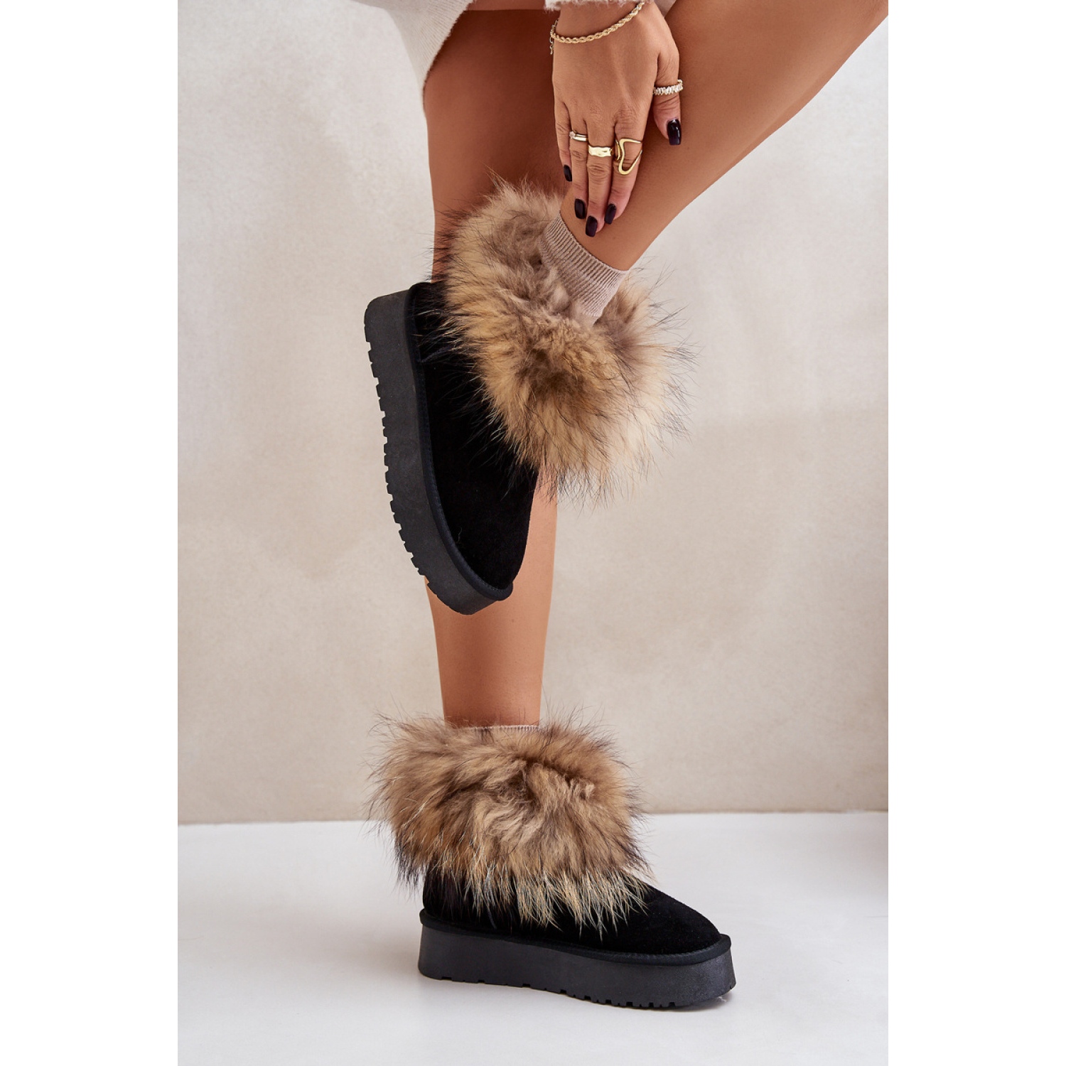 La parte superiore della tomaia è decorata con una pelliccia soffice, che aggiunge non solo il fascino, ma anche il calore aggiuntivo, che li rende un elemento insostituibile di guardaroba invernale. Gli stivali da neve sono incorporati su una piattaforma stabile con un'altezza di 3,5 cm, il che li rende comodi anche durante le passeggiate più lunghe.