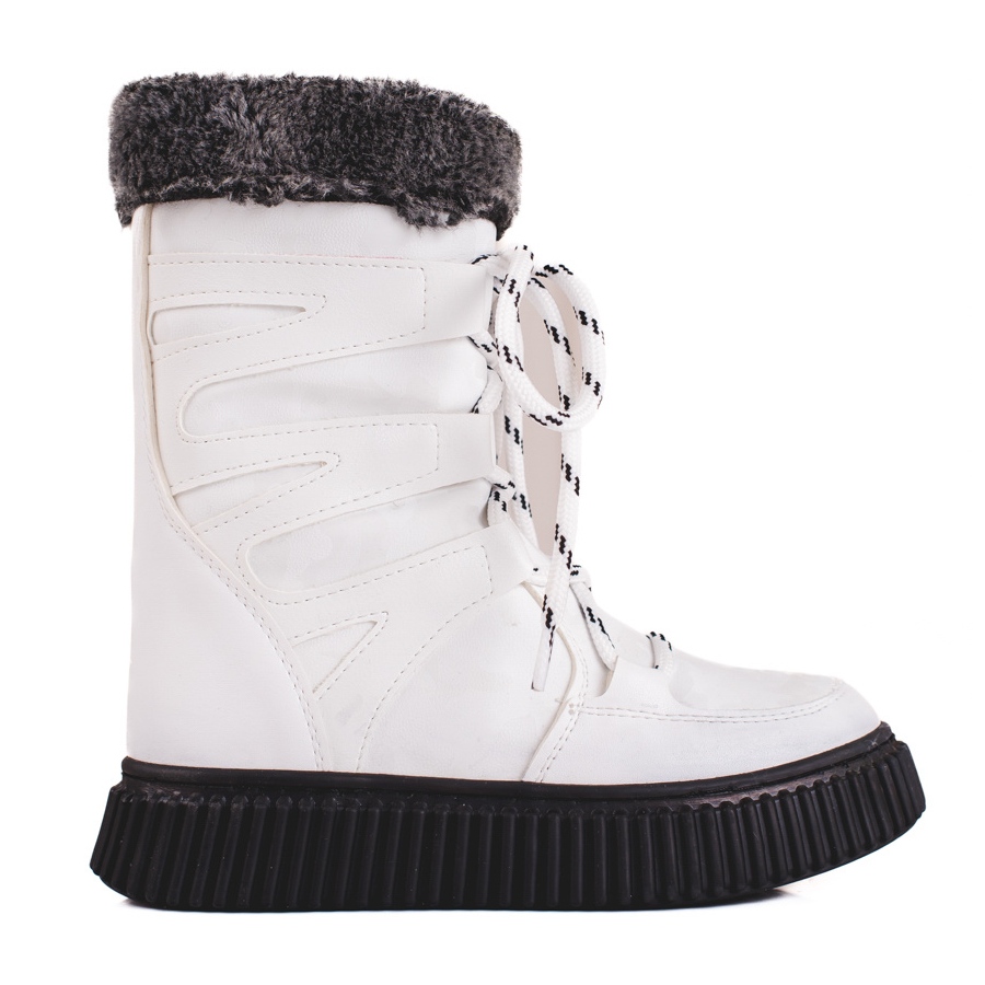 Stivali da neve per bambini moderni e confortevoli di W. Potocki in un modello mimetico bianco e bianco. La combinazione di soluzioni pratiche e stile casual fa funzionare le scarpe ogni giorno - per l'asilo, per una passeggiata o un divertimento all'aperto.