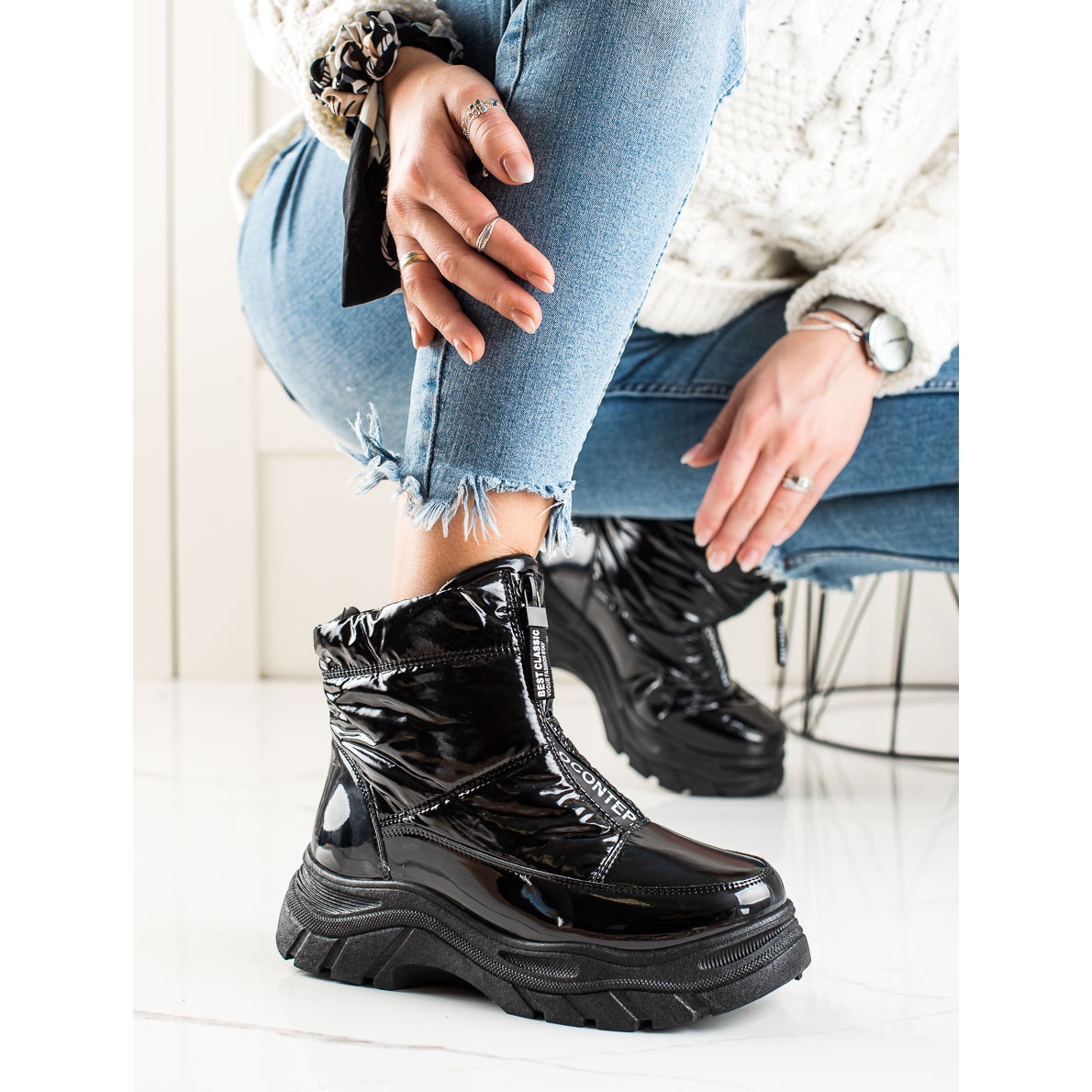 La suola in plastica con battistrada garantisce un'aderenza adeguata su superfici scivolose, il che rende questi doposci funzionali ed eleganti. La finitura nera e la mancanza di fantasia li rendono adatti a vari outfit, aggiungendo loro stile.