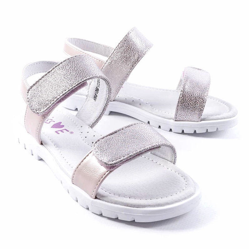 I sandali hanno la punta tonda e la numerazione standard, che facilita la scelta della taglia giusta. L'imballaggio originale del produttore è una scatola che garantisce la conservazione e il trasporto sicuri delle scarpe. I sandali sono bassi, con tacco o plateau alti 2 cm. Non hanno alcun motivo dominante, sono di colore uniforme: rosa con sfumature argentate.
