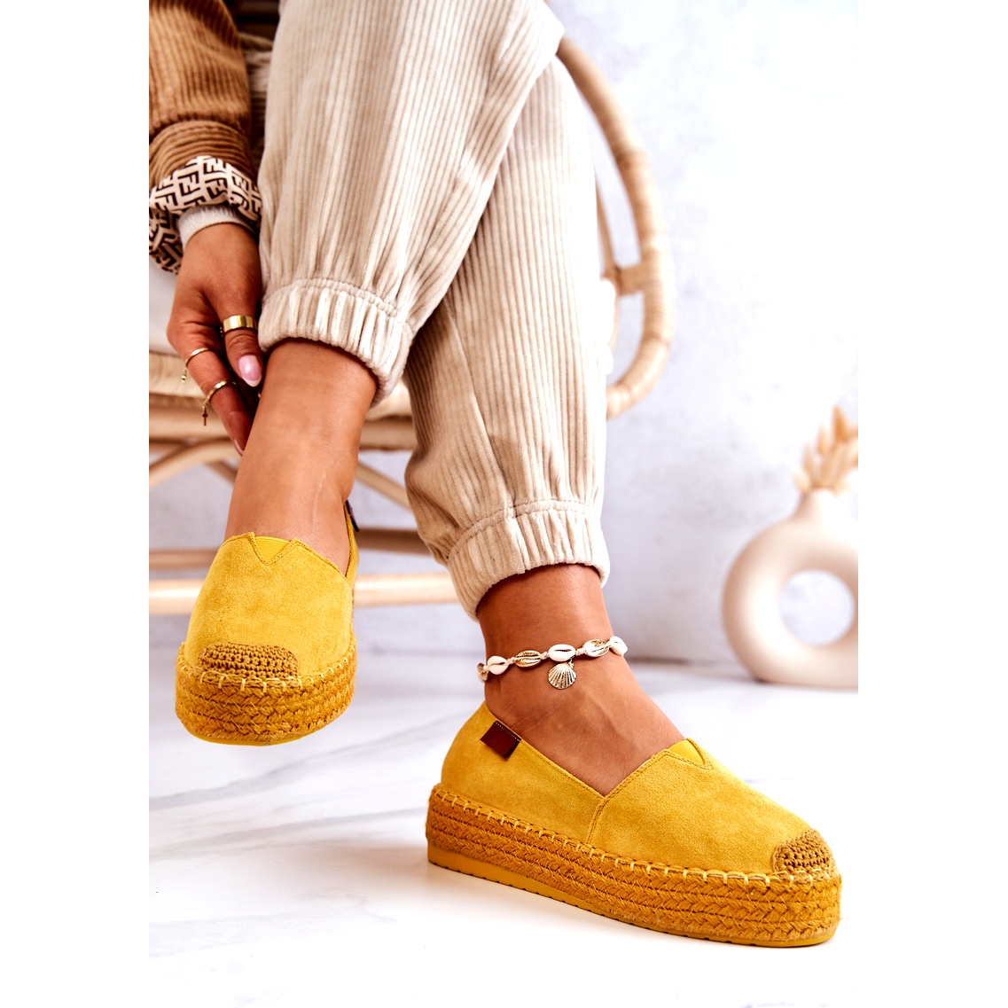 Espadrille sensazionali su una spettacolare piattaforma intrecciata - perfetta per l'estate! Realizzato in cambio ecologica piacevole al touch, con un inserto materiale e una fodera in pelle ecologica. Il vivido colore giallo aggiungerà stile casual e set estivi e il taglio slip -up offre comfort e rapidamente. Sono fantastici per il lavoro, per incontrare amici e viaggiare.
