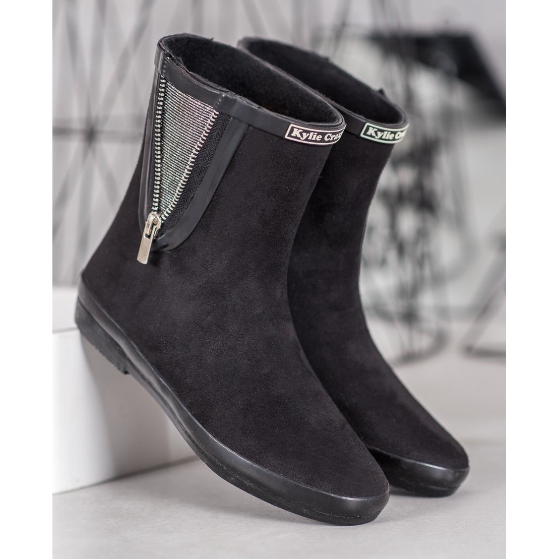 Scopri eleganza e funzionalità insieme grazie agli stivali Wellington in pelle scamosciata Kylie con cerniera nel classico colore nero. Queste scarpe uniche, realizzate in gomma impermeabile e pelle scamosciata, sono perfette per le giornate di pioggia, unendo stile e praticità.