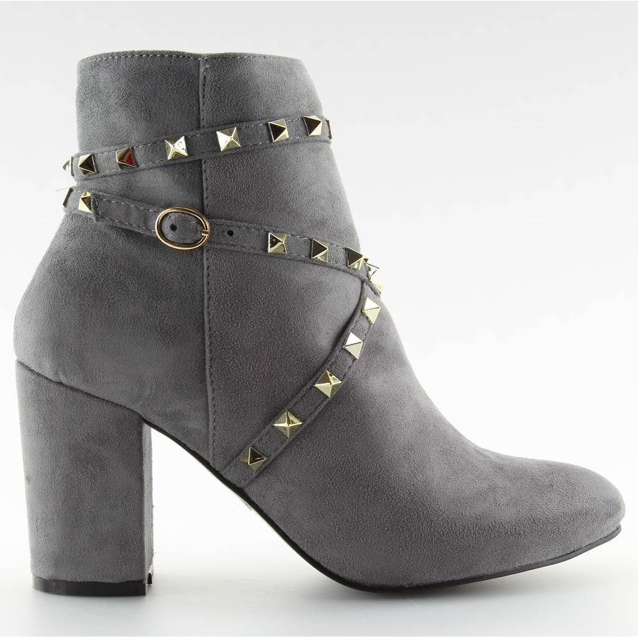 Eleganti stivaletti da donna con tacco stabile, alti 9 cm, realizzati in pelle scamosciata ecologica. Isolati con delicata pelliccia all'interno, forniscono comfort e calore nelle giornate più fredde. Le strisce decorative con borchie dorate intorno alla caviglia donano carattere. Grazie alla cerniera interna, indossare e togliere è veloce e comodo. La classica punta rotonda e il tacco ben sagomato fanno sì che le scarpe si adattino bene al piede e siano stabili mentre si cammina.
