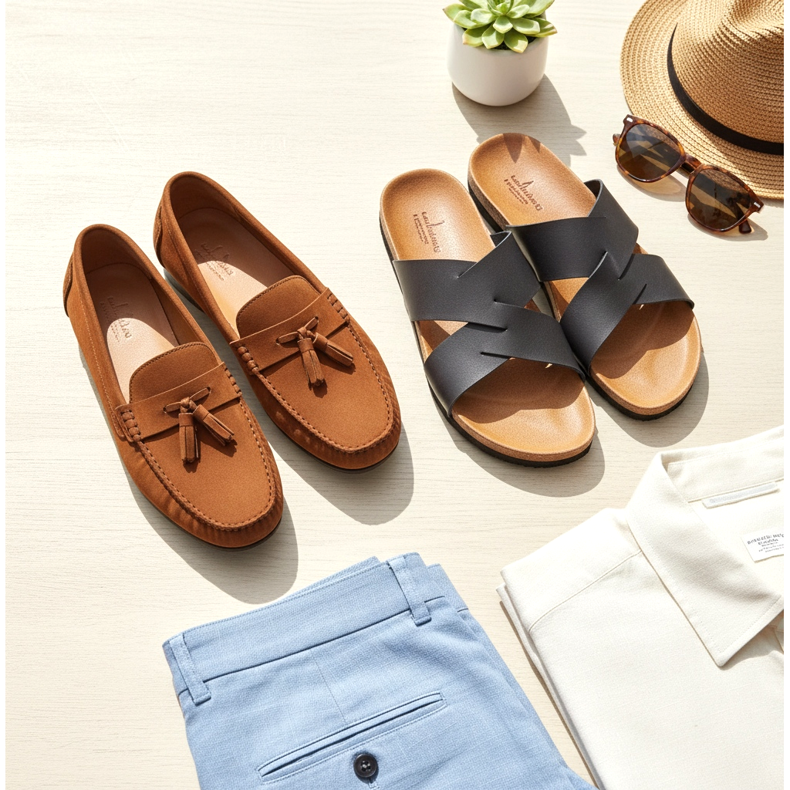 Il quarto paio sono scarpe per le giornate calde, più eleganti delle sneakers, ma meno formali delle scarpe. Mocassini o mocassini in pelle sono la scelta perfetta per la primavera e l'estate. Puoi indossarli senza calzini, con pantaloni chino arrotolati o jeans leggeri, creando un look casual ma elegante.