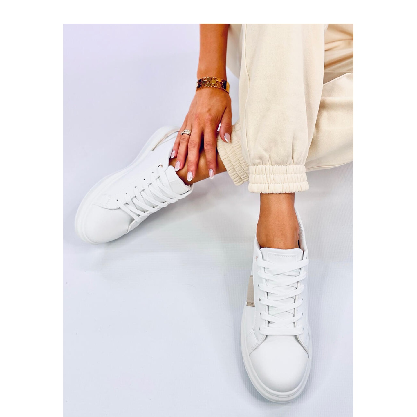 Sneaker sulla piattaforma Holms Beige di Inello è la scelta perfetta per le donne che cercano sia lo stile che il comfort. Queste scarpe sportive uniche combinano varie trame e design di materiali, il che le rende estremamente efficaci. Il colore bianco delle scarpe da ginnastica combinato con un inserto dorato nella suola dà loro un carattere ed eleganza unici.