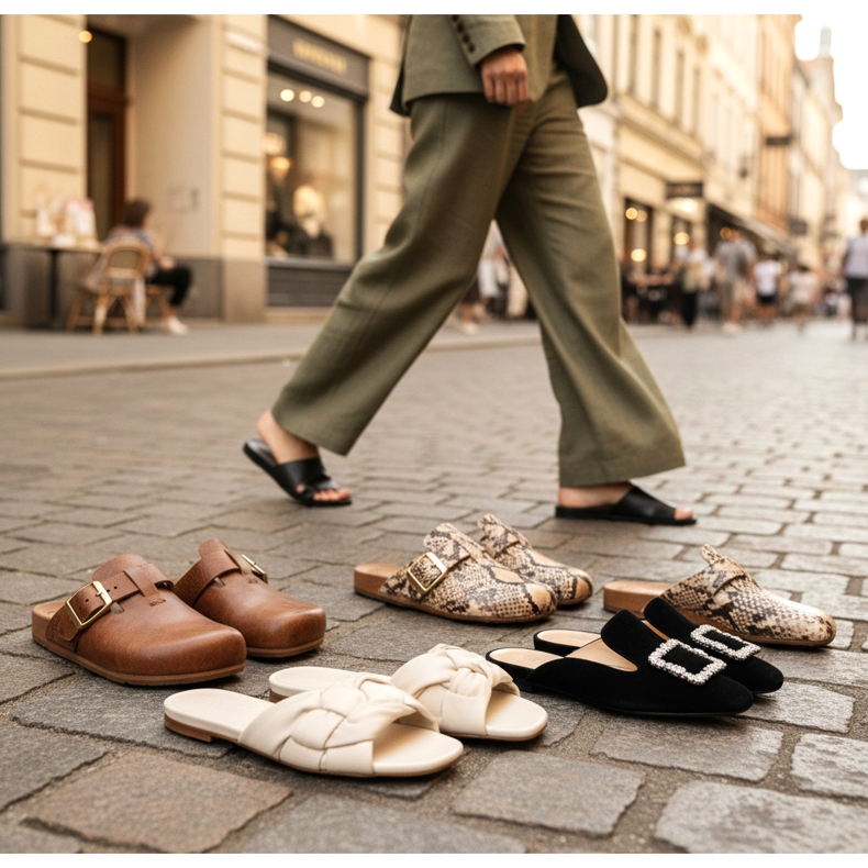 I sabot, invece, sono un ibrido tra una pantofola e un'infradito: una scarpa chiusa davanti e aperta dietro. La loro popolarità è esplosa qualche stagione fa e non mostra segni di declino. Nel 2026 dominano le versioni in pelle naturale, pelle scamosciata o con motivi in rilievo, molto più raffinate rispetto alle precedenti versioni in plastica.