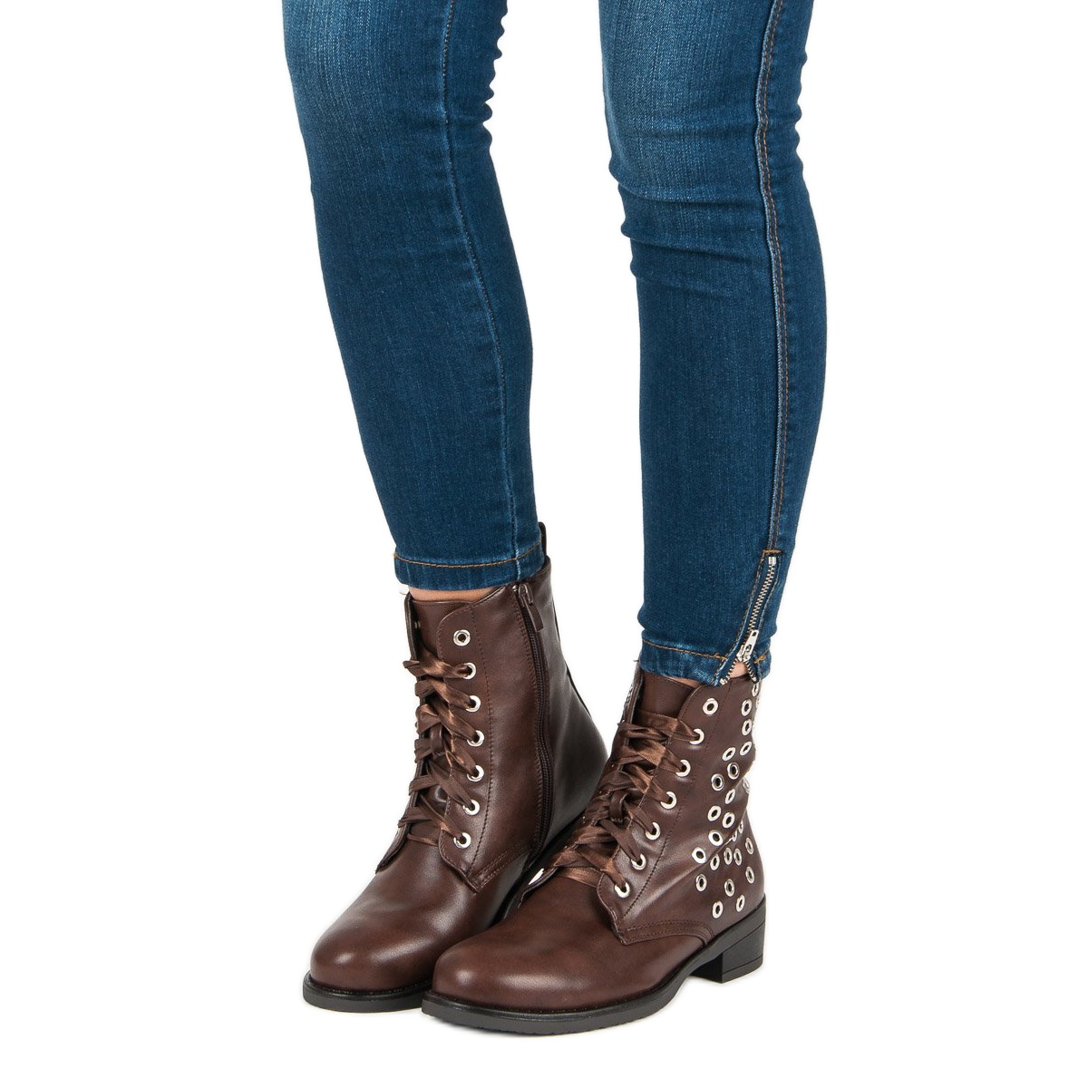 Gli stivali da lavoro marroni sono dotati di robusti lacci marroni e di un'attraente cerniera laterale, che non solo sottolineano il loro carattere moderno, ma li rendono anche più facili da indossare. Ulteriori decorazioni sotto forma di strass conferiscono loro un'atmosfera rock, perfetta per uno stile casual.