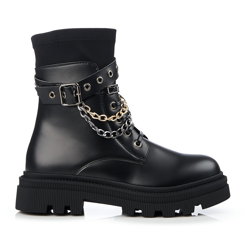 Presentiamo calzature da donna uniche con catene di Shelovet, che delizieranno ogni amante delle scarpe alla moda e comode. Realizzati in pelle ecologica e materiale tessile di alta qualità, questi stivaletti neri uniscono eleganza e stile rock, abbinandosi perfettamente ad un look casual e quotidiano.