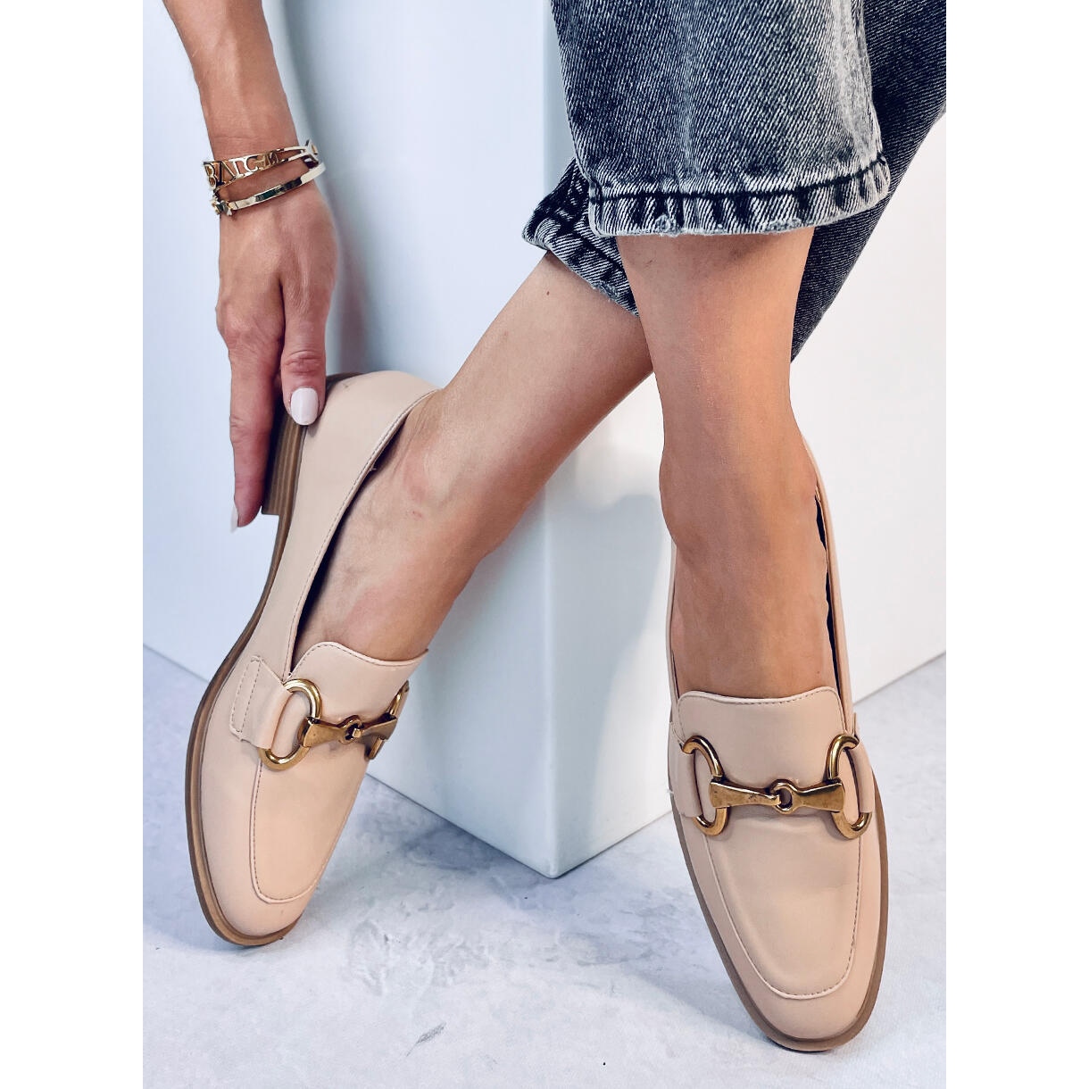 Realizzati in ecopelle di alta qualità, questi mocassini offrono non solo stile ma anche comodità di utilizzo. La decorazione dorata a forma di catena aggiunge eleganza e li distingue dagli altri modelli. Il tacco piatto alto 2,5 cm garantisce comodità quando indossato, e il colore liscio e beige si abbina perfettamente a diversi outfit.