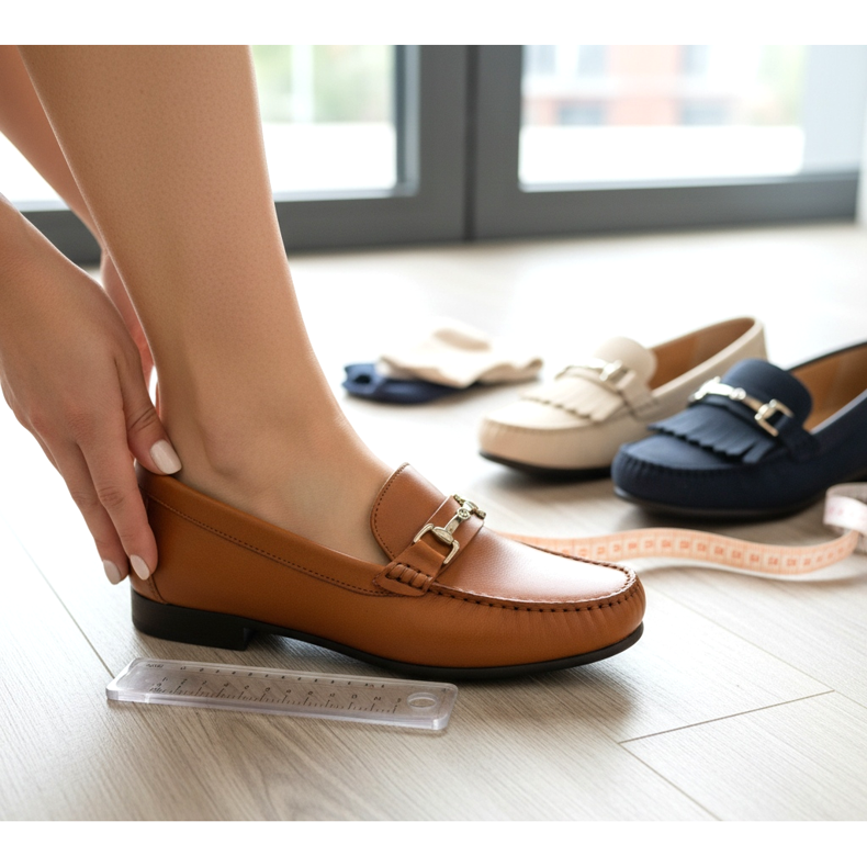 Lunghezza del piede questa è la misura base. I mocassini dovrebbero adattarsi delicatamente al tallone e avere circa 0,5-1 cm di spazio davanti alle dita. Le scarpe troppo strette resteranno strette, quelle troppo larghe cadranno quando si cammina.