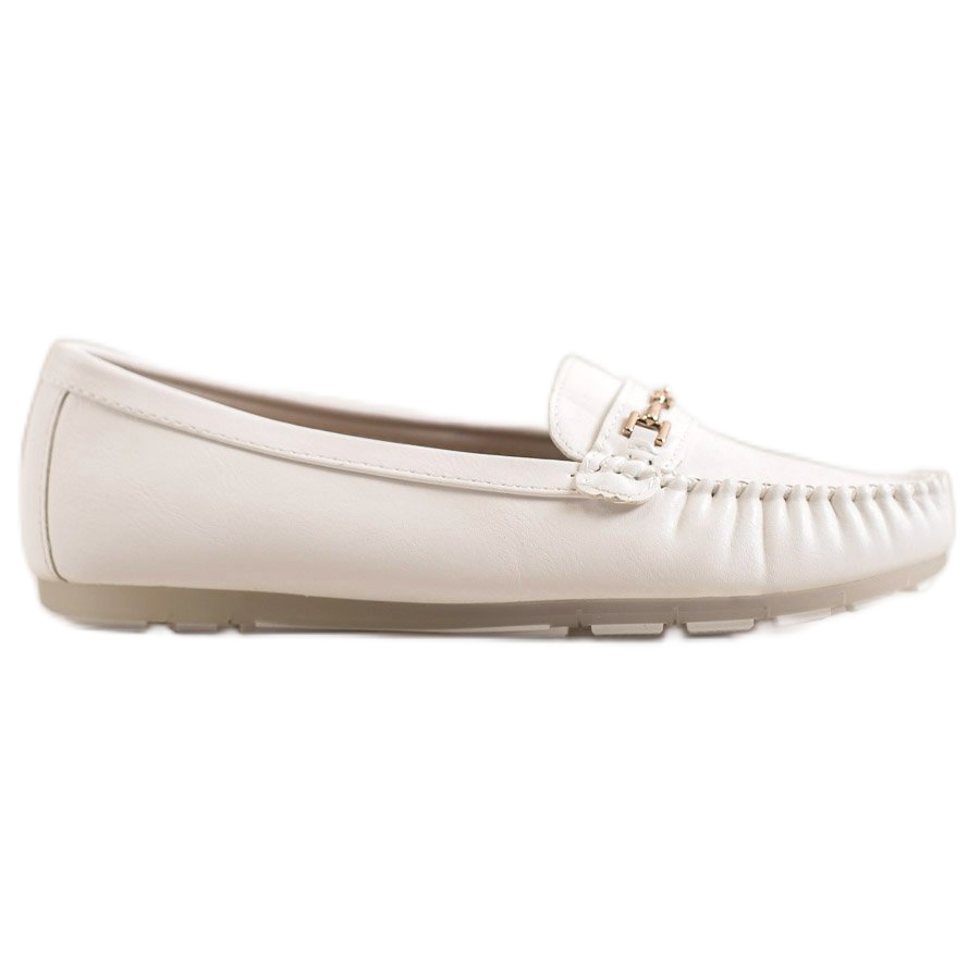 La loro suola in plastica, progettata pensando al comfort, arricchita con battistrada, garantisce stabilità e comfort durante l'uso. I mocassini hanno un tallone morbido e chiuso, che aumenta il comfort. La punta rotonda conferisce loro un look elegante, e gli elementi decorativi in metallo dorato posti sulla tomaia conferiscono loro un carattere lussuoso.