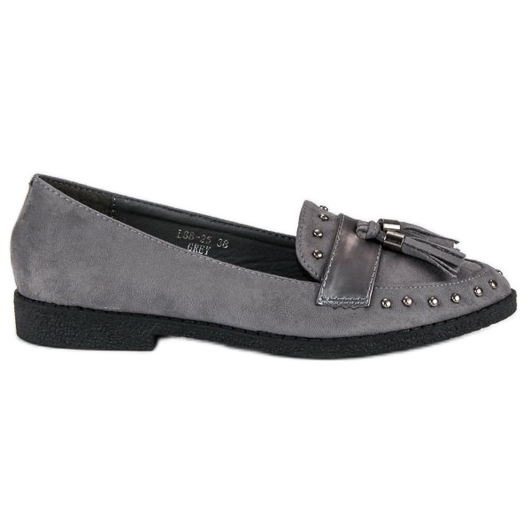 I mocassini decorati con frange e sottili borchie diventano non solo calzature, ma un vero e proprio elemento di espressione della moda. Sono perfetti sia per stili casual che più eleganti. Senza motivo e nel classico colore grigio, saranno un complemento perfetto per molti outfit.