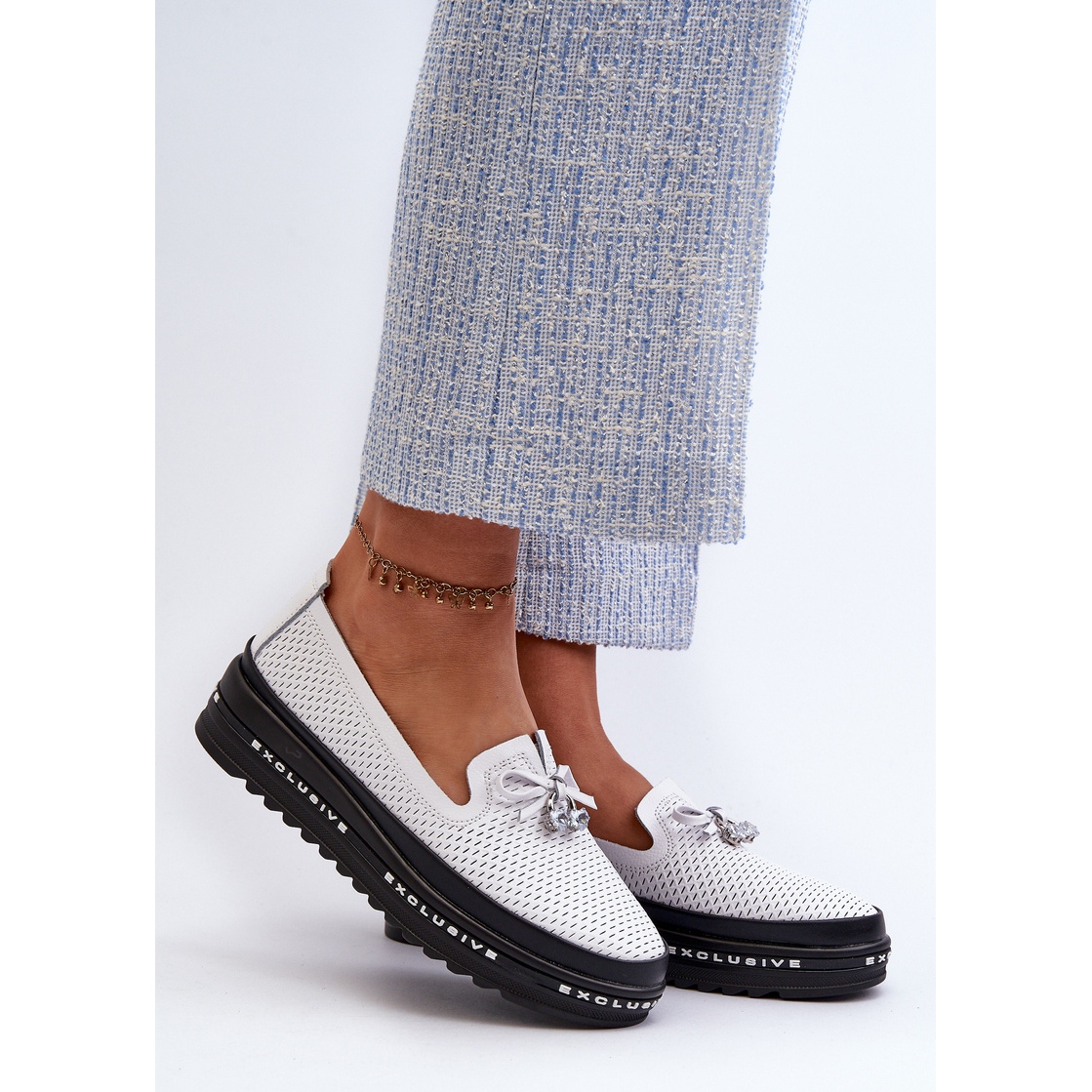 La piattaforma alta da 3,5 cm dà loro un accento alla moda e allo stesso tempo rende i piedi meno stanchi durante l'usura per ore. I mocassine si distinguono per un dettaglio di buon gusto sotto forma di elementi di lavoro aperto e un delicato arco, il che li rende un complemento perfetto per vari stili, da casual a più eleganti.