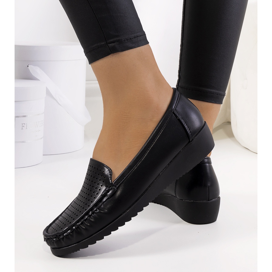 I mocassini neri con zeppa Dalal sono un'ottima scelta per le giornate primaverili e completeranno perfettamente qualsiasi stile. Queste eleganti scarpe da donna si distinguono per una tomaia in pelle ecologica di qualità, decorata con un elegante motivo traforato che aggiunge loro leggerezza e originalità.