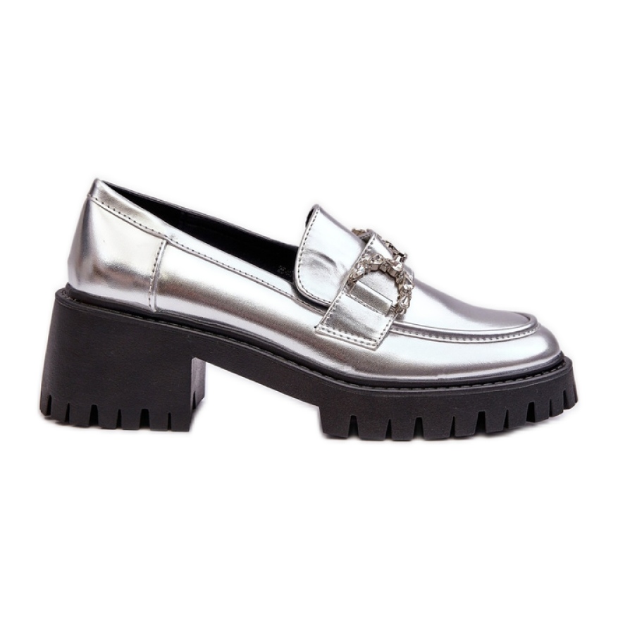 Nella parte anteriore dei mocassini c'è una decorazione di gioielli che attira l'attenzione e dà alle scarpe un personaggio unico. Il tallone irrigidito garantisce una vestibilità perfetta, che rende questo modello perfetto per i giorni autunnali. I mocassini d'argento saranno un ottimo complemento per molti stili, da casual a più formale.