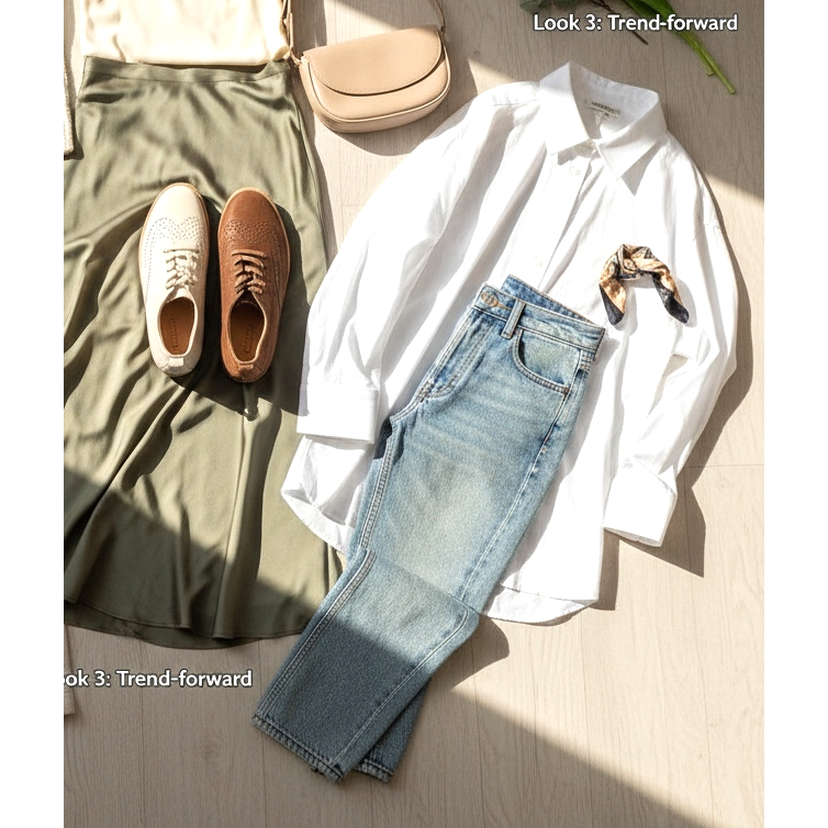 Look 3 - Tendenza in avanti: Derby color crema + jeans vintage (leggermente sbiaditi, intorno alla vita) + camicia bianca oversize infilata nei pantaloni. Effetto parigino, senza pretese, elegante.