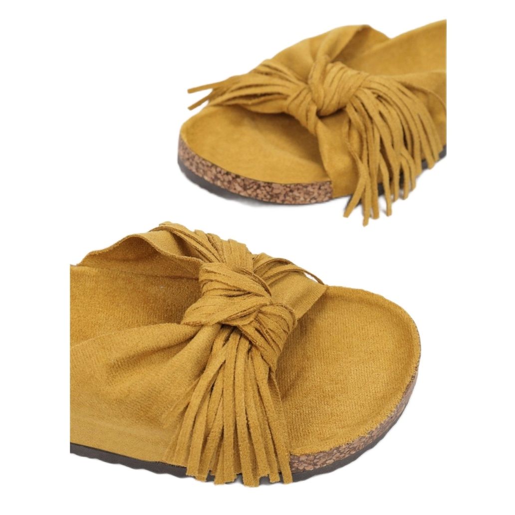 Un ampio cinturino sulla punta, legato con un cinturino coordinato con frange decorative, attira l'attenzione e conferisce alle infradito un carattere unico. Realizzate in eco-pelle scamosciata di alta qualità, le infradito uniscono eleganza e praticità, e la loro suola sintetica garantisce resistenza e comfort per tutta la giornata.