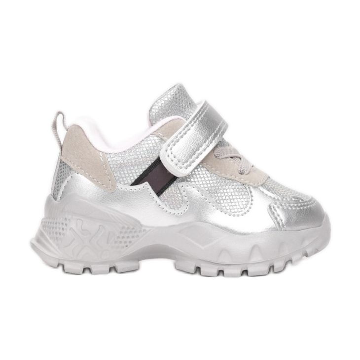 Le scarpe sportive Vices T7890-52 in argento sono la scelta perfetta per le bambine che apprezzano sia lo stile che il comfort. Queste moderne sneakers sono montate su una suola piatta e spessa, i cui lati sono decorati con eleganti scanalature. Il battistrada stabilizzante sul fondo offre un'aderenza eccellente, rendendoli la scelta ideale per il gioco e le attività quotidiane.